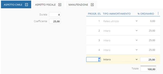Attenzione, la percentuale impostata su riga con tipo ammortamento "Rateo utilizzo" non verrà considerata nel totale.