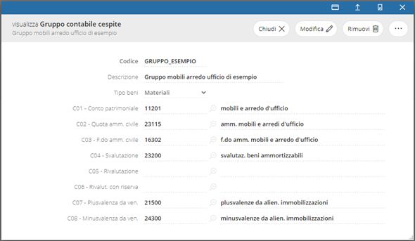 Codice: campo alfanumerico di 15 caratteri, che identifica il gruppo contabile di suddivisione dei cespiti.