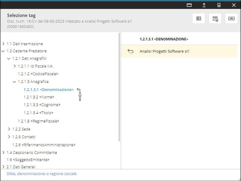 ] sarà possibile selezionare un documento normalizzato dal quale reperire le informazioni, in modo da valorizzare automaticamente il tag selezionato con il contenuto del file XML.