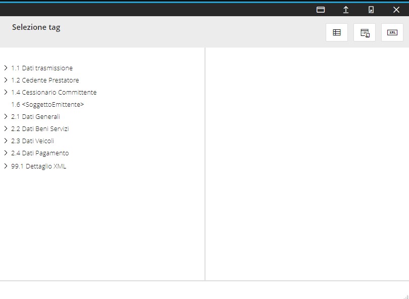 Tramite le icone di testata sarà possibile passare alle altre visualizzazioni. Selezionando le altre icone di testata si passerà alla visualizzazione in formato lista o in formato tabelle. Infine tramite l'icona XML sarà possibile selezionare un documento normalizzato dal quale reperire le informazioni in modo da valorizzare automaticamente il tag selezionato con il contenuto del file XML.
