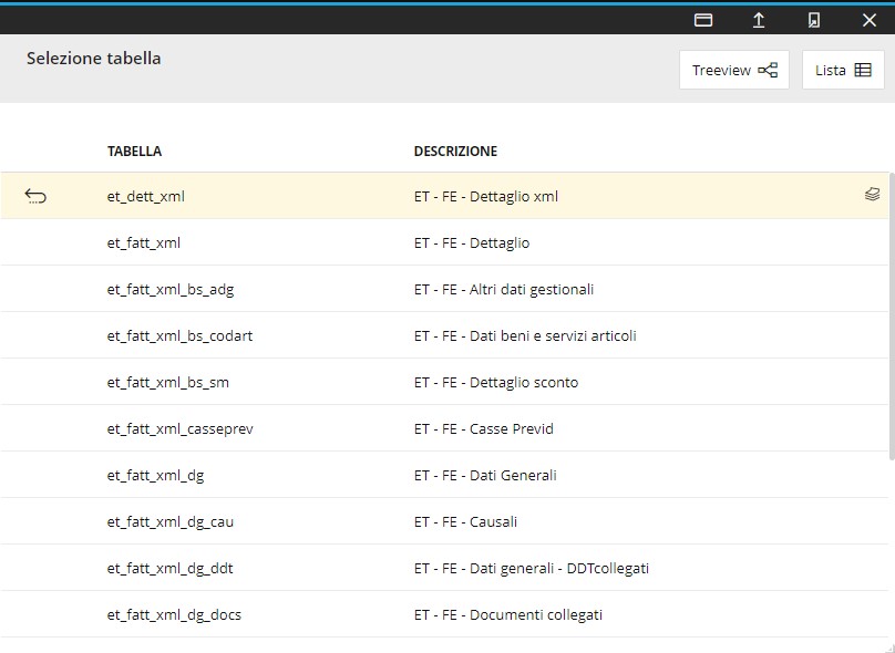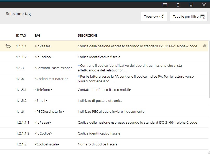 La modalità di default è in formato Treeview, con visualizzazione del nome dei tag che possono essere utilizzati. Utilizzando la lente a fianco della tabella filtro la procedura proporrà la visualizzazione seguente